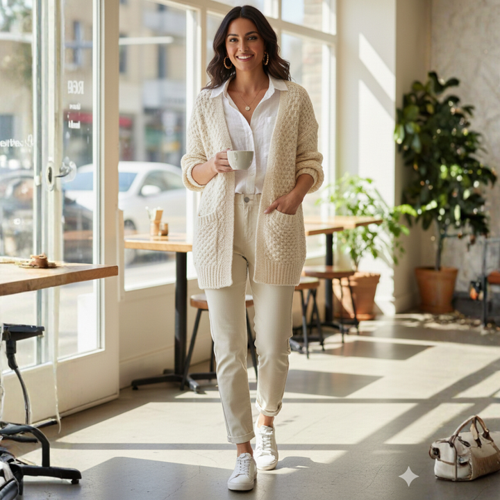 · Color & Fabric: Presented in a beautiful, light neutral shade (such as ivory, ecru, or pale beige), offering a sophisticated alternative to traditional denim. The fabric appears to have a soft, comfortable feel.