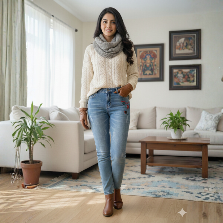 Step out in style and comfort with these effortlessly chic embroidered light-wash denim jeans! Perfect for year-round wear, these jeans blend classic appeal with a touch of unique, playful detail.