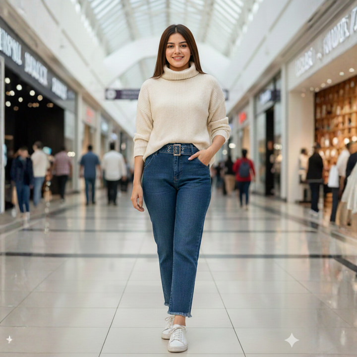 JN-003 High-Waist Buckle-Detail Denim Jeans